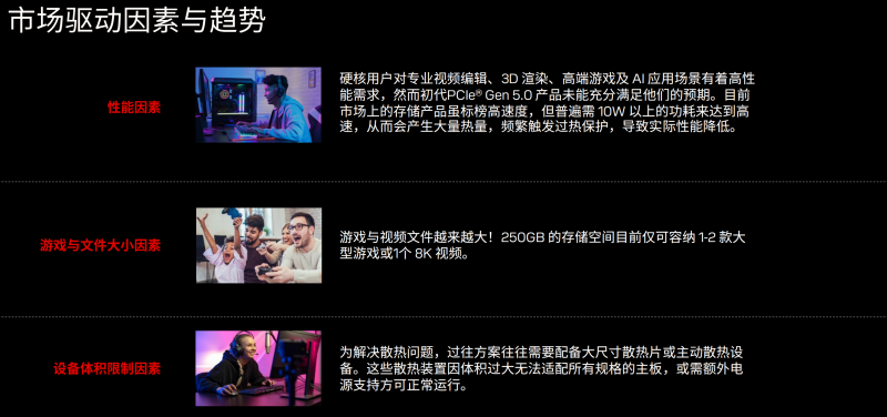 游戏领域中,PCIe Gen 5.0 SSD 可缩短大型场景加载时间,这对开放世界游戏和实时渲染需求的满足至关重要;内容创作场景下,8K视频剪辑、3D建模等高负载任务的数据吞吐效率大幅提升,直接优化了专业工作流程。