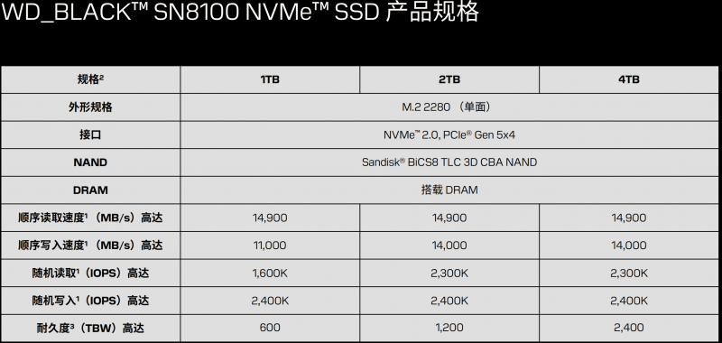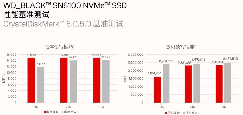 根据闪迪官方数据,我们可以看到在顺序读取性能方面,无论是1TB、2TB还是4TB版本的WD_BLACK SN8100 NVMe SSD,均能够实现14900MB/s的顺序读取速度,已经是目前PCle Gen 5.0产品的极限了。同时其随机性能也非常棒,2TB和4TB容量版本能够达到2300K IOPS。