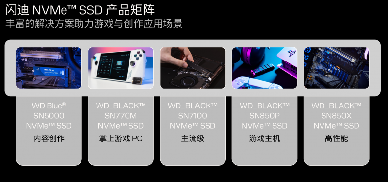在WD_BLACK SN8100加入之前,闪迪旗下已经拥有丰富的产品线,用以满足不同用户、场景的使用需要,其中包括应对内容创作的WD Blue SN5000 NVMe SSD、应对掌上游戏PC的WD_BLACK SN770M NVMe SSD、应对主流级应用场景的WD_BLACK SN7100 NVMe SSD、应对游戏主机的WD_BLACK SN850P NVMe SSD PS5授权版以及应对高性能需求的WD_BLACK SN850X NVMe SSD: