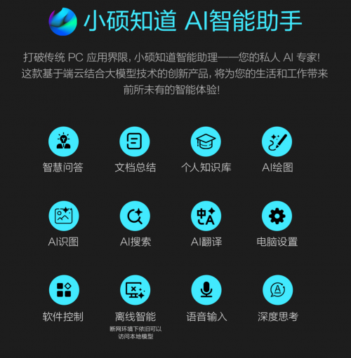 华硕无畏Pro16 2025新增“小硕知道”AI智能助手,带来智慧文档、文档总结、AI绘图、AI识图、AI搜索、AI翻译等较多使用功能,全面提升工作与生活效率。依托端云一体AI大模型,即使断网也能继续使用,随时随地给你高效助力。并且小硕知道首次针对独显GPU进行了优化加速,AI生成速度大幅提升,体验更加迅捷流畅。