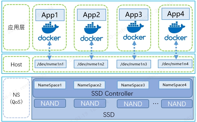 相较于传统机械硬盘,SSD凭借其高速读写能力和低延迟特性,不仅突破了存储I/O瓶颈,更能与Docker轻量级容器化技术深度契合——通过减少数据存取等待时间,充分释放存储性能潜力,为容器化部署MySQL的高效运行筑牢存储根基。Namespace(以下简称NS)作为SSD技术的重要创新,进一步突破了传统存储模式的性能瓶颈。NS本质上是SSD的逻辑分区技术,能够将单块物理SSD划分为多个独立的虚拟存储单元,每个单元均可进行独立管理和配置,有效提升SSD的利用率。在此基础上,NS技术下配置QoS(Quality of Service,服务质量)策略,能够进一步强化存储性能管理的精细化程度。