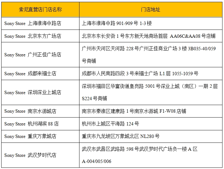 更多实时动态,敬请关注索尼中国在线商城(https://www.sonystyle.com.cn/)、索尼影像圈官方微博(http://weibo.com/diclubsony)或索尼中国微信公众号(微信号:sonycn_001)和索尼影像圈官方微信公众号(微信号:sonycn_002)或垂询以下门店。