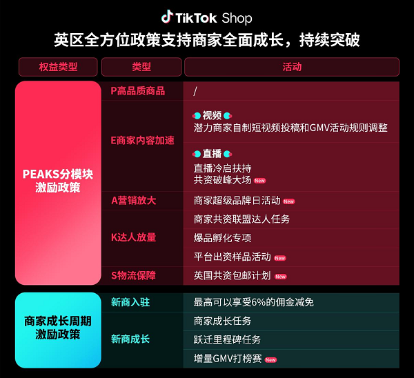TikTok Shop持续加码欧洲市场支持力度,在原有政策基础上推出覆盖“商品、内容、营销、达人、物流”五大维度的PEAKS全周期激励方案。新入驻商家可享阶梯式佣金减免,其中,英区商家最高可以享受6%的佣金减免,而高潜力卖家更有机会通过GMV打榜赛斩获最高1.2万英镑奖励。
