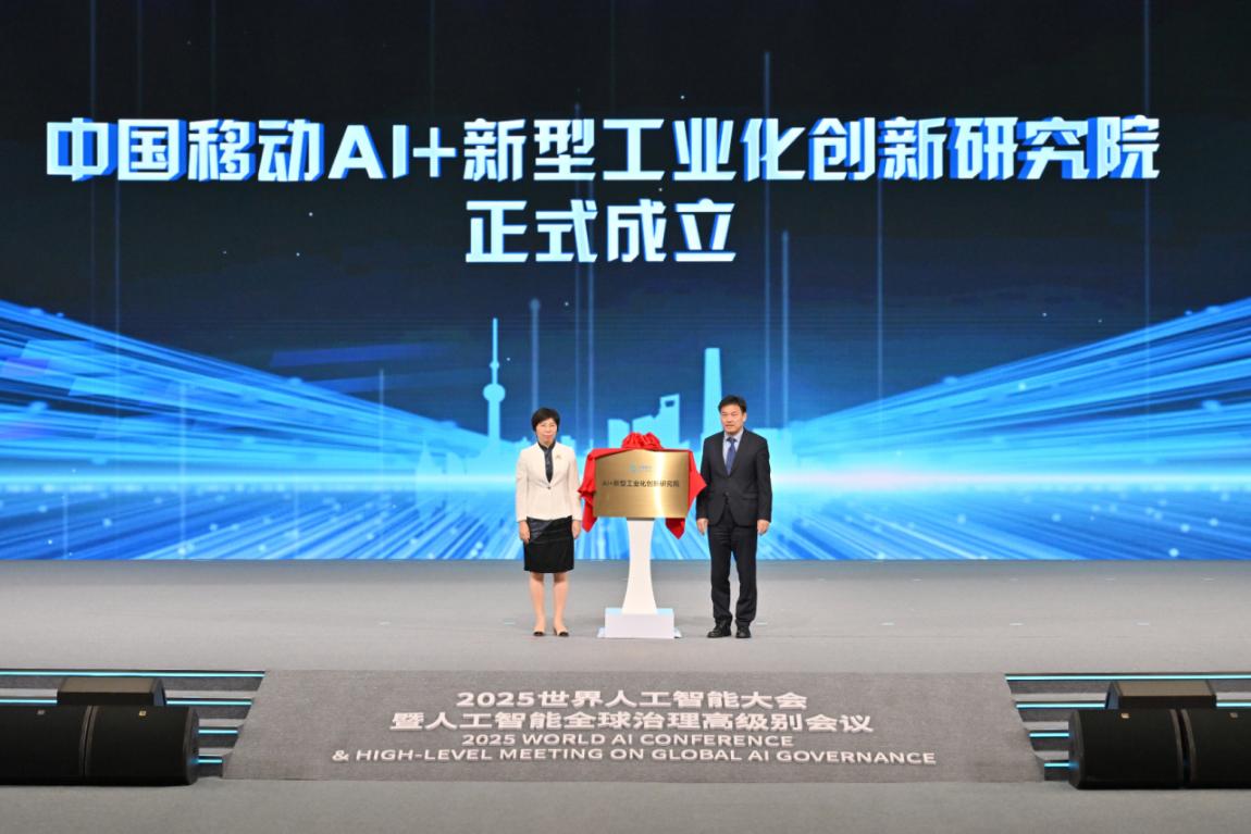 会议期间,上海市政府副秘书长、上海市经济和信息化委员会主任张英,中国移动副总经理程建军在闭幕式上共同为“中国移动 AI+新型工业化创新研究院” 揭牌。