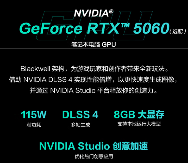 NVIDIA GeForce RTX 5060 基于先进的 Blackwell 架构,拥有强大的图形处理能力 。其满血功耗为 115W,配备 8GB GDDR7 显存,显存带宽速率 384GB/s,核心频率 1215MHz,Boost 频率 1560MHz,拥有 3328 个 CUDA 核心 。