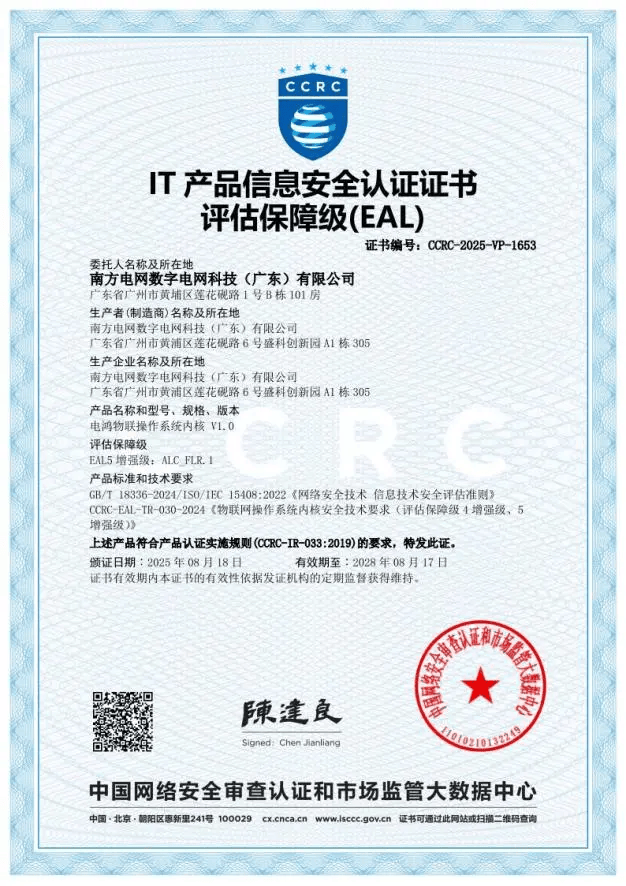 近日,由南方电网公司基于开源鸿蒙研发的电鸿物联操作系统内核获得中国网络安全审查认证和市场监管大数据中心(CCRC)颁发的EAL5+安全认证证书,电鸿成为国内首个由企业自主研发并获得最高安全级别认证的物联操作系统内核,标志着南方电网公司在工业互联网核心基础软件领域安全可控的重大突破。