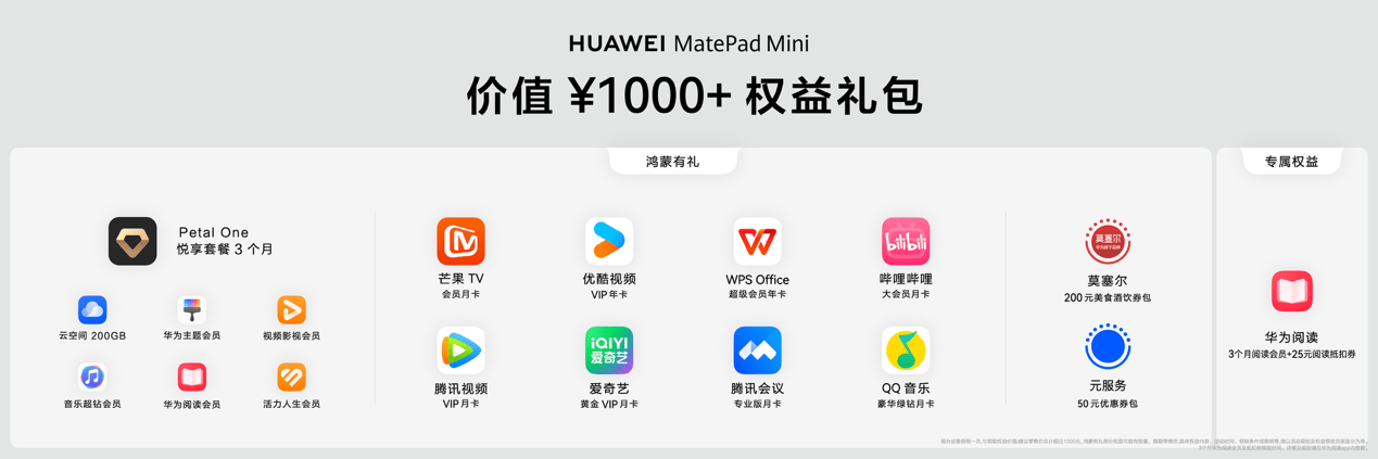 购买华为平板MatePad Mini的用户,可以参加“鸿蒙有礼”领取Petal One悦享套餐,其中包含3个月华为阅读会员。此外,华为阅读还将为新机用户额外提供3个月阅读会员与价值25元的代金劵。两项权益叠加后,用户购买新机直接就能获得6个月的阅读会员,畅读百万好书。