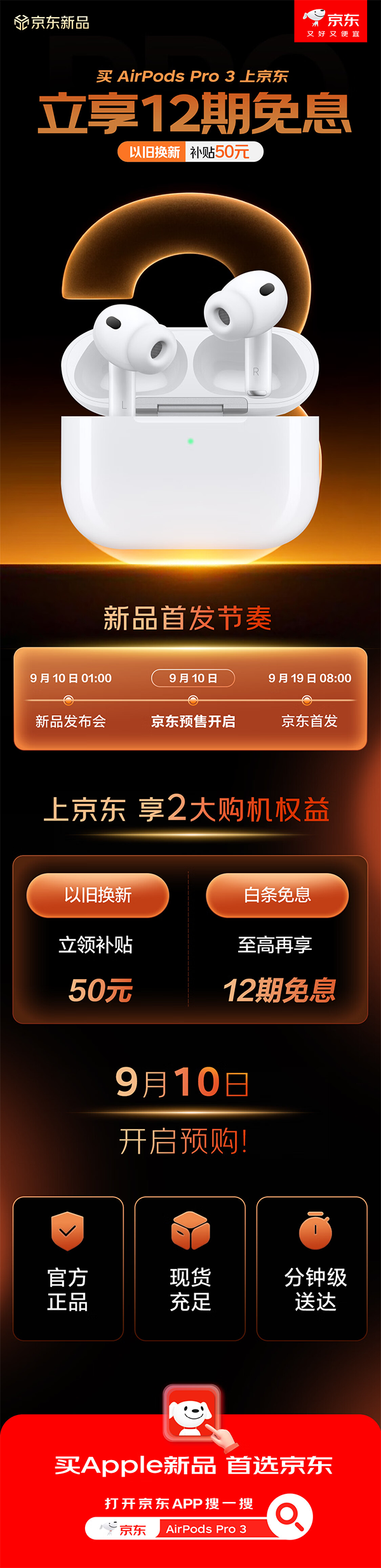 北京时间9月10日凌晨,Apple如期举办秋季新品发布会,重磅推出iPhone 17系列、新款Apple Watch及AirPods等多款新品。备受期待的iPhone 17系列将于9月12日20点开启预购,9月19日正式开售。目前,Apple产品京东自营旗舰店已同步开启预约通道,并加码10亿iPhone 17换新补贴,帮助用户以更优价格入手正品好货,只需打开京东搜索“苹果新品福利”即可。通过京东购买iPhone 17系列新品的果粉,可享受以旧换新至高补贴2100元、指定型号国补优惠500元、至高24期免息等权益,更有下单iCloud、AppleCare享85折、App Store充值卡至高优惠9折等丰富权益,让换新更轻松、更划算!此外来京东购Apple新品,可享分钟级送达。对于想快速入手iPhone 17系列新品的果粉,可以在全国Apple授权的近万家专营门店,通过京东秒送购买Apple新品,先人一步到手新机。