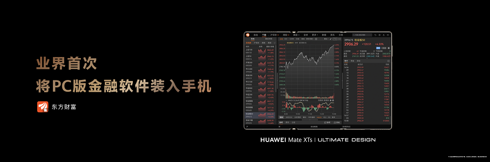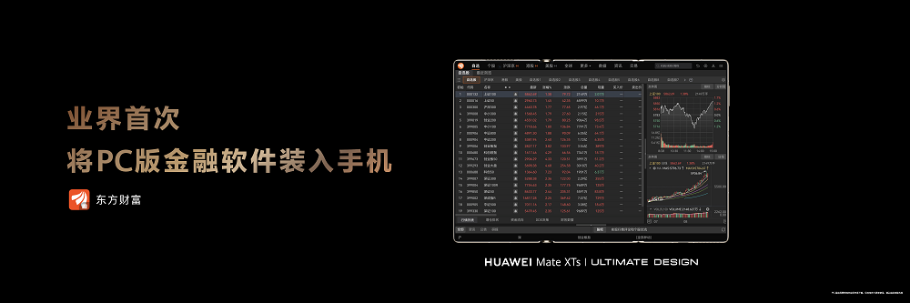 华为Mate XTs非凡大师现已正式开售,作为首款出厂即全面搭载HarmonyOS 5.1的三折叠手机,华为Mate XTs非凡大师携手东方财富等伙伴,实现业界首次将PC版金融应用装入手机的重要突破。东方财富全面拥抱鸿蒙5,不仅让用户可在手机端畅享PC级专业投资理财服务,更率先探索元服务卡片、鸿蒙智能体等创新形态,在实现投资理财体验全面进阶的同时,打造了金融服务鸿蒙化的新样本。