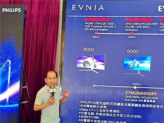 冠捷科技副总裁兼OBM显示器BU中国区/亚太区总经理阎立东作开场致辞。阎总指出,当前显示行业正迎来从“规模扩张”向“价值创造”的结构性变革,顺应这一趋势,飞利浦深度洞察用户对高分辨率、高刷新率、高画质的核心需求,在OLED、Mini LED等前沿技术领域持续深耕的基础上,进一步强化游戏子品牌EVNIA的垂直生态布局。基于此,飞利浦将发布游戏子品牌EVNIA的中文名称“弈威”,并打造“健康+AI”双核电竞品牌理念,全面推动中高端桌面显示产品在视觉精度、响应速度与健康体验上的全维度升级。