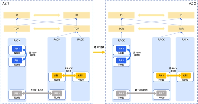 服务与实例部署:通过统一云管平台完成服务和实例的规划落位。跨机柜部署的 Region 级别服务,利用跨 AZ 迁移能力进一步分散在每一个 AZ 的不同机柜,并通过负载均衡实现业务双活。此时,为了保障服务连续性,借助仲裁机房的独立仲裁节点构建分布式共识体系,从而保障主 AZ 故障时快速完成 Region 服务的主节点选举。