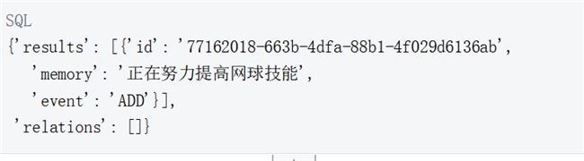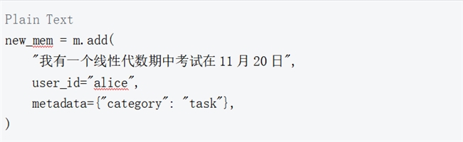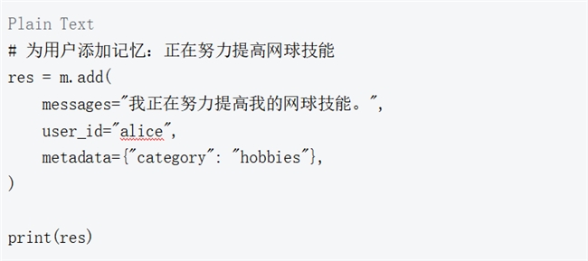 add 函数将非结构化文本作为记忆存储在百度向量数据库中,并将其与特定用户和可选元数据关联。在这里添加Alice的记忆"正在努力提高我的网球技能",以及相关的上下文元数据到百度智能云向量数据库。