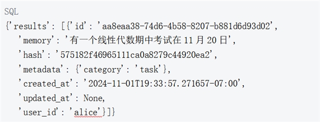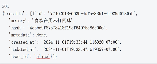 可以使用 get_all 函数查看百度向量数据库中所有插入的记忆或按 user_id 过滤。注意!这里可以看到记忆现在从"正在努力提高网球技能"更改为"喜欢在周末打网球"。