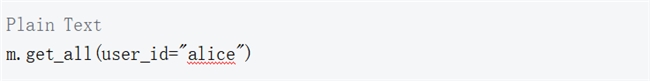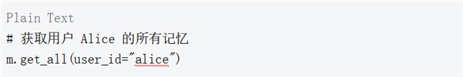 现在调用 get_all 指定 user_id 来验证确实为用户 Alice 有 2 个记忆条目。