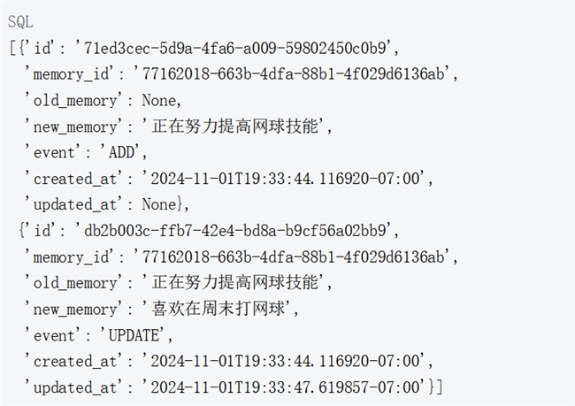 还可以通过 history 函数指定我们感兴趣的 memory_id 来查看记忆更新历史。