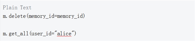 还可以通过提供相应的 memory_id 来 delete 记忆。将删除记忆"喜欢在周末打网球",因为其 memory_id 已经被检索,并调用 get_all 来验证删除是否成功。