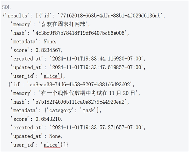 可以使用 search 函数为用户查找最相关的记忆。可以先为 Alice 添加另一个记忆。