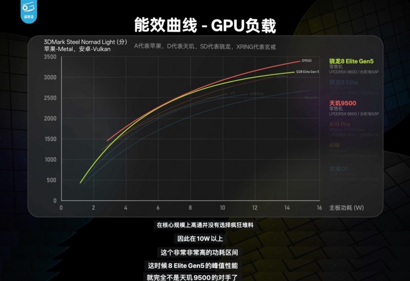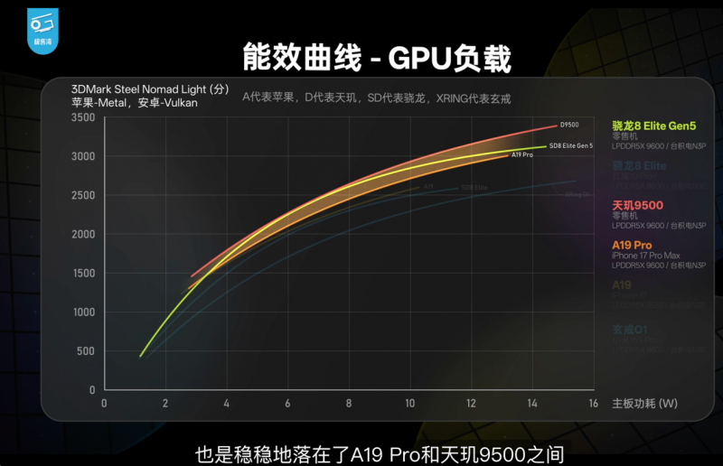 再来看,今年的骁龙8 Elite Gen5的GPU能效曲线,正好处在天玑9500和A19 Pro之间,直白点来说落在了一个较为“尴尬”的位置。
