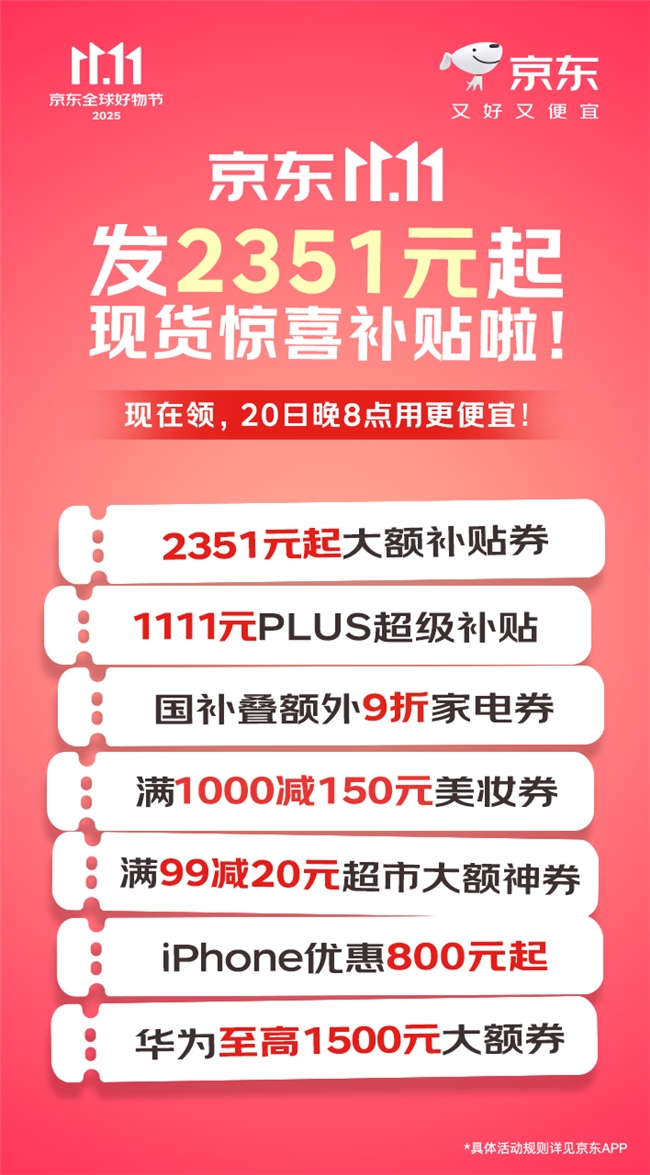 在旺盛的品质消费需求下,京东11.11热度持续攀升。10月20日晚8点,京东11.11开启“超级补贴日”,带来海量品质好物低价特惠。与此同时,为给更多消费者带来又好又便宜的消费体验,京东11.11还带来补贴加磅,推出2351元现货惊喜补贴,消费者打开京东APP搜索“京东双11”即可一键解锁多张大额补贴券,在购物时使用。