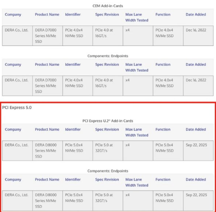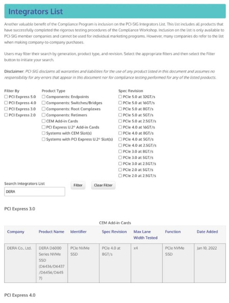 值得关注的是,从PCI-SIG官方Integrators List可查询到,得瑞已实现三代PCIe SSD产品(D8000/ D7000/ D6000)的PCI-SIG认证覆盖,构建起从PCIe 3.0到PCIe 5.0的完整合规产品矩阵。
