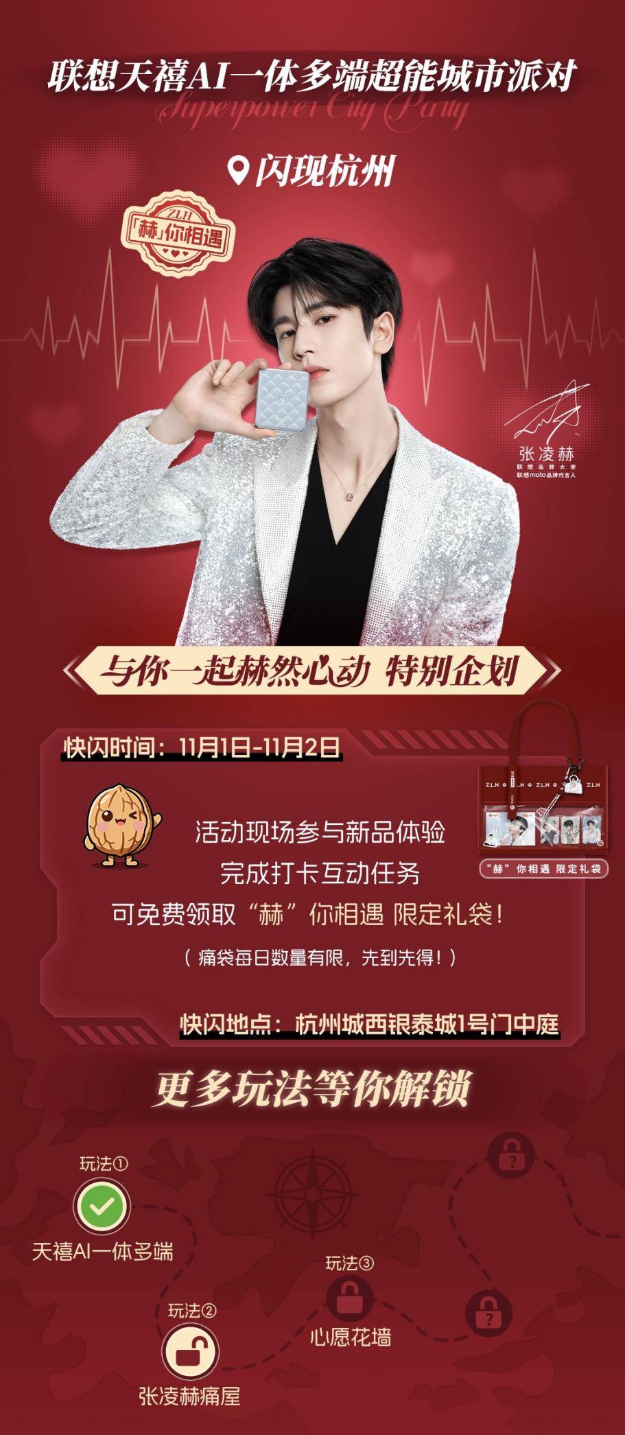 除遍布全国的门店活动外,联想于11月1日至11月2日,在杭州城西银泰城打造一场限时两天的“联想天禧AI一体多端超能城市派对”快闪活动。现场不仅设有新品体验区,更精心布置了“心愿花墙”与“张凌赫痛屋” 等沉浸式打卡点。粉丝现场参与体验新品即可免费领取“赫”你相遇限定礼袋,更多惊喜玩法等待小核桃们亲临解锁。