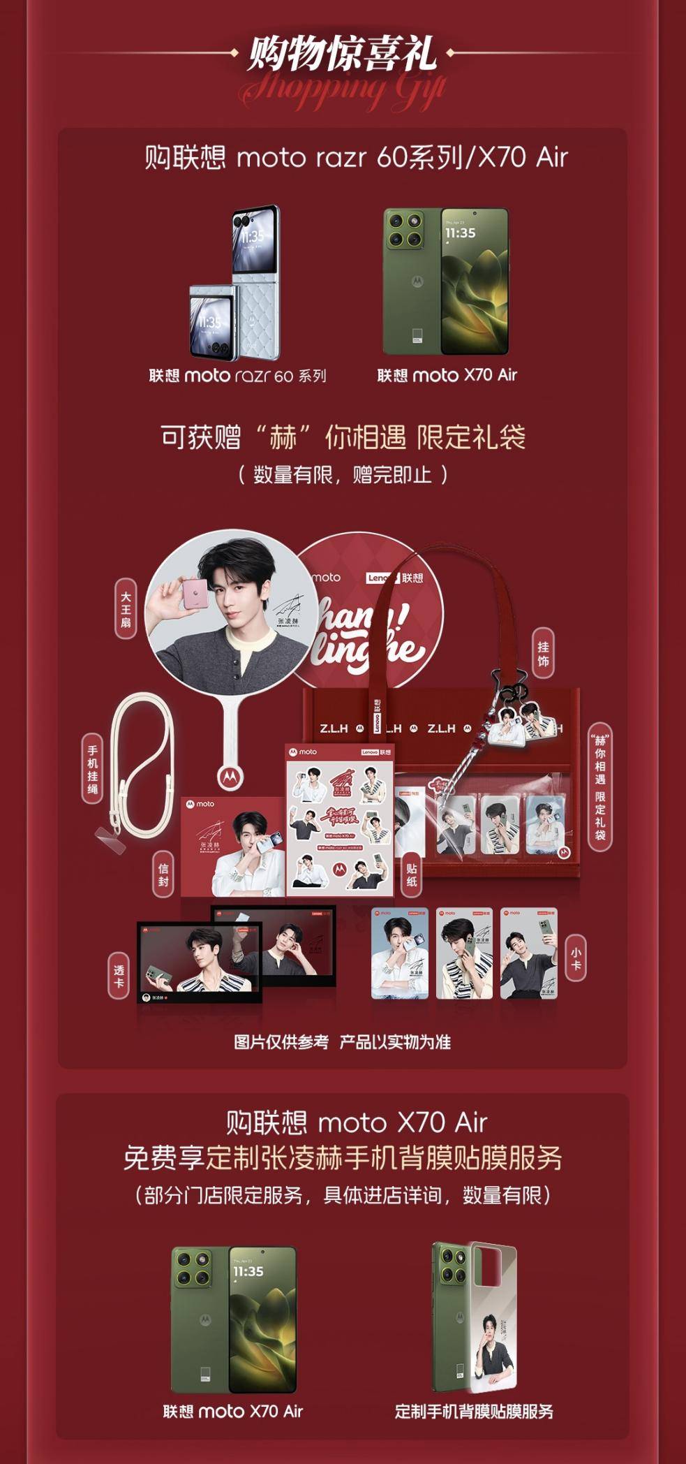 进店粉丝用户可参与“粉丝心意墙”互动赢取“进店礼”,在11月1日至2日中午12:30期间,写下对张凌赫的生日祝福并合影发布社交媒体,即可获赠限定海报、明信片及惊喜周边。现场完成手机与平板产品体验,还可领取门店定制体验礼。购机用户更可尊享双重礼遇:购买moto razr 60全系列或X70 Air,即赠“赫”你相遇限定礼袋;选购X70 Air更可免费贴上定制的代言人专属背膜。此外,在高德或美团平台评价门店即可再获赠证言人海报与明信片组合。数量有限,先到先得哦。