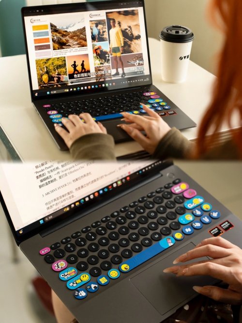 如果说好屏幕是硬实力,那圆键盘和笑脸贴纸就是精准的情绪暴击。当所有笔记本键盘都长一个样时,Hi MateBook 14这套以波点艺术为灵感的圆滚滚键帽瞬间让人眼前一亮。每颗圆形键帽均遵循人体工学设计,最大弯曲深度达0.25mm,完美贴合指腹弧度,搭配1.5mm舒适键程,让每一次敲击都如轻舞般优雅愉悦。键盘表面还做了多层复合油漆涂层,抗污耐磨,“皮实耐造”。还有不知道哪个天才网友带的头,说这圆键盘还象征“圆满”,每次敲键盘都像在给工作进度手动祈福,太形象了。