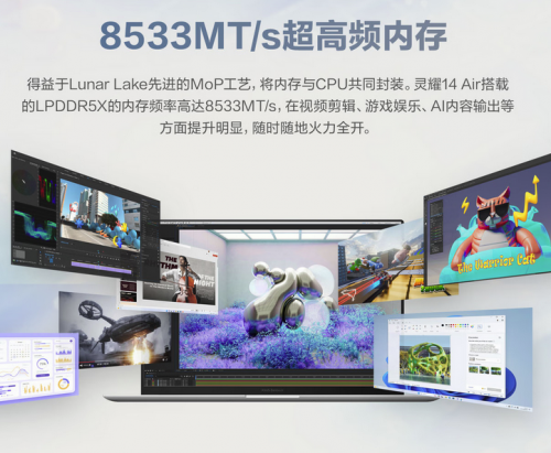此外,它还标配32GB LPDDR5X 8533MT/s高频大内存,在运行PS、Pr等大型软件时候系统响应速度更快,1TB PCIe 4.0 SSD固态硬盘则提供了更为充裕存储空间,安装大型软件、存储素材文件更加游刃有余,无需为存储空间不足而感到焦虑。