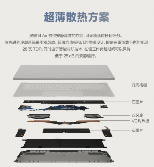 华硕灵耀14 Air虽然拥有轻薄机身,但在散热方面也毫不含糊。它采用超薄散热方案,由双风扇搭配超薄均热板构建起高效散热体系,能迅速排出处理器等部件运行时产生的热量,有效避免因温度过高导致蓝屏死机的现象。机身由2715个经CNC加工的散热孔有序排列,在排出热量的同时,还能有效抑制灰尘和水的进入,确保笔记本在长时间运行下依然稳定可靠。