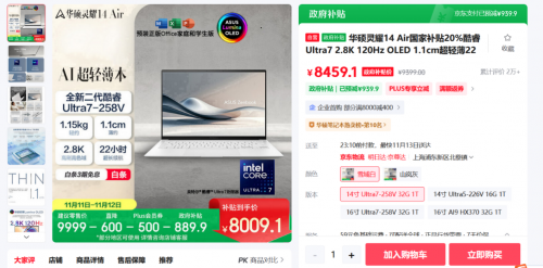 在当下这个快节奏的时代,若想保持工作的高效状态,一台性能强劲且兼具轻便特性的轻薄本已然成为不可或缺的存在。华硕灵耀14 Air超轻薄本深度贴合用户需求,搭载英特尔酷睿Ultra7 258V处理器、仅约1.15kg的轻薄机身以及长达22小时的超长续航时间,完美契合了用户对于极致轻薄、高效性能以及超长续航的追求。最近,这款超轻薄本经过平台补贴后实际到手价仅需8009.1元,追求极致轻薄与高性能的朋友们,可千万别错过这个较好机会。
