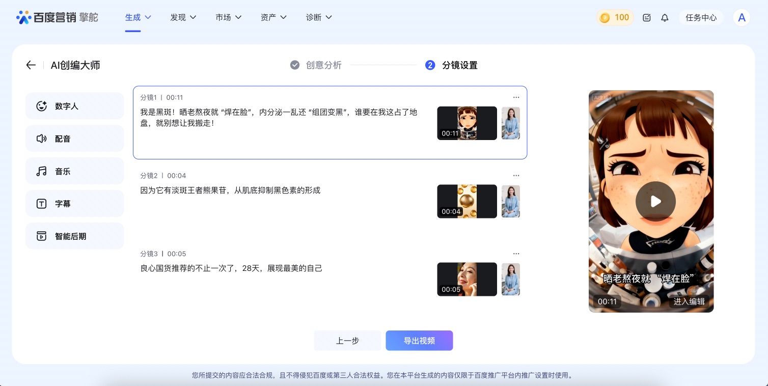 在擎舵能力加持下,水初语还探索了更多创意营销方式,通过雀斑拟人化的趣味表达方式,基于擎舵AI创编大师多样化视频套路理解和多模态生成能力,结合片段生成、AI模特能力,突破传统模特拍摄、场景搭建、后期剪辑等耗时费力环节的限制,视频制作人效提升100%,让国货品牌的科技实力与文化底蕴在 AI 的助力下,绽放更耀眼的光芒!