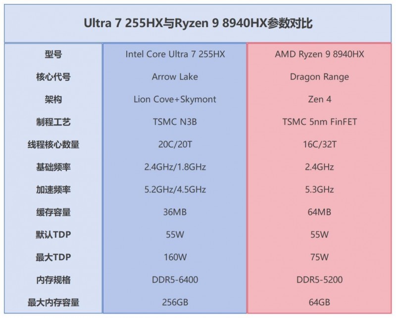 一、核心对决:酷睿Ultra 7 255HX vs锐龙9-8940HX