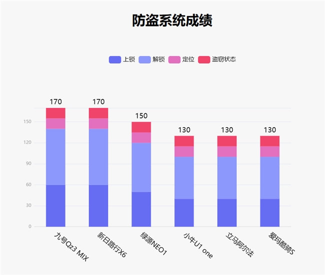 防盗系统测试中,九号Qz3 MIX和新日路行X6得到最高的170分,两款车型的防盗方案基本相同,均配备北斗、GPS、基站三模精准定位,同时支持感应解锁、NFC刷卡解锁、小程序解锁、智能手环、密码及语音解锁等。此外像添加家庭账号,家人用车远程解锁等功能也有配备。不仅如此,九号Qz3 MIX还支持黑匣子+事故主动求救及AHRS姿态感应防盗,相比其余车型要更为全面。