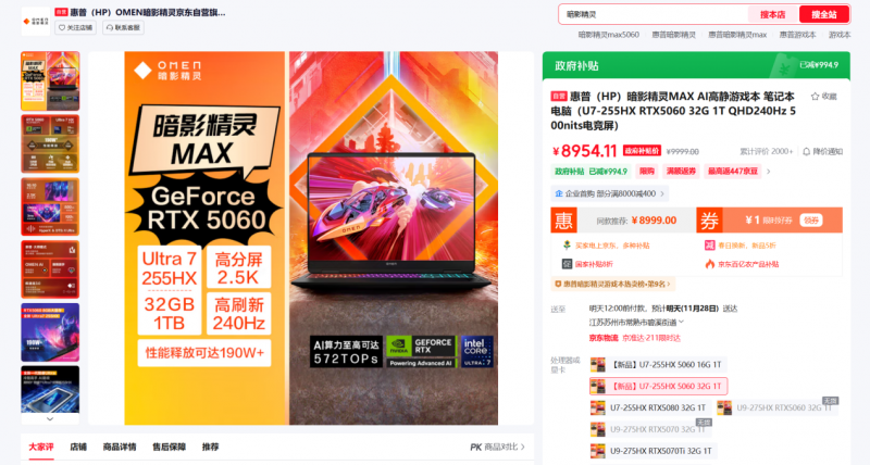• 惠普暗影精灵MAX酷睿版(Ultra 7 255HX):主打“高性能、低功耗、静音运行”,凭借均衡稳定的综合表现与开箱即用的优化体验,为追求沉浸式游戏与可靠品质的核心玩家提供安心选择。