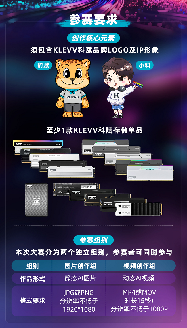 奖项设置方面,本次大赛也诚意满满,礼品总价值过万。金奖及银奖获得者均能获得现金奖励及DDR5内存1套,而新锐参与奖10名,则将获得KLEVV科赋定制周边礼包一份。图片组及视频组各13人能获得最终奖励,评选标准将依据作品创意度、故事性、品牌元素融合度、传播力、AI技术实现力进行综合评判。