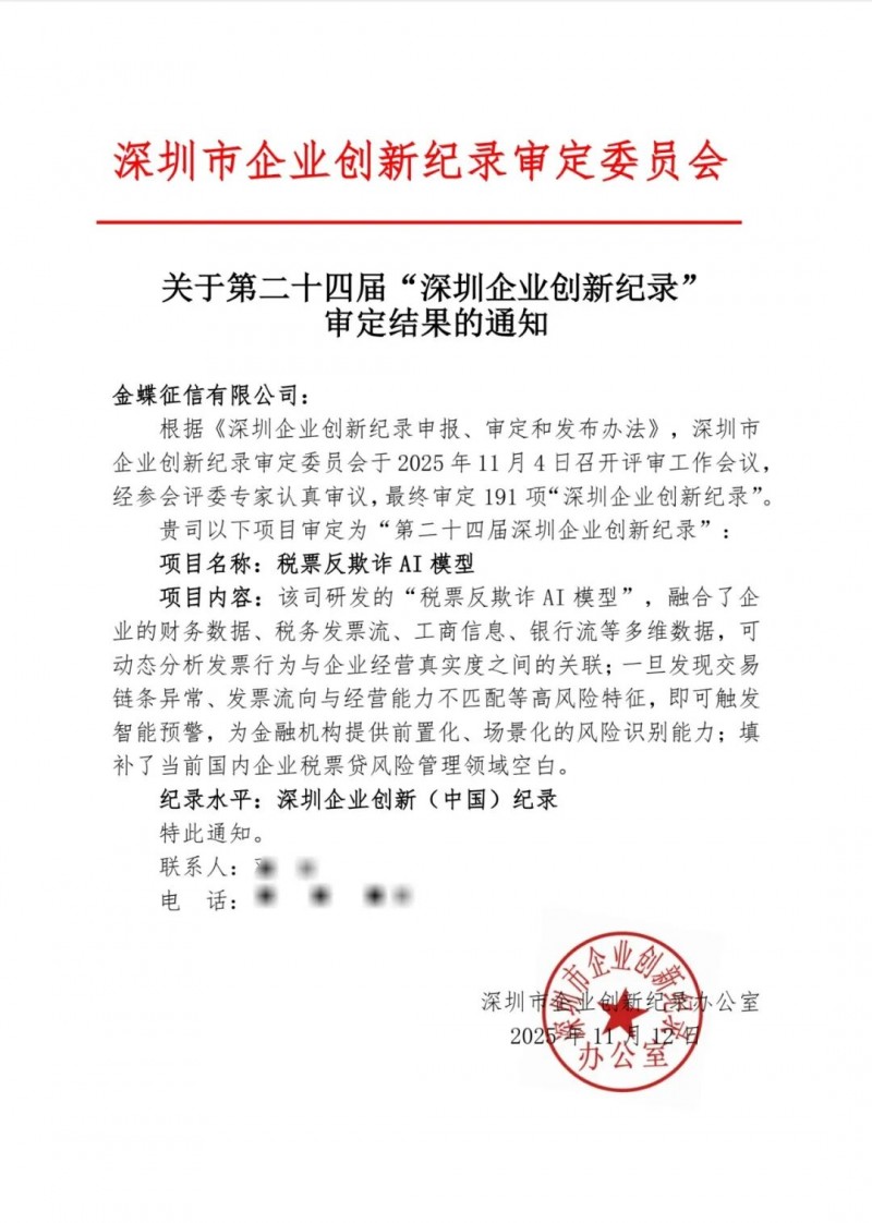 近日,金蝶征信自主研发的“税票反欺诈AI模型”获评第24届“深圳企业创新纪录”。据悉,本届奖项经深圳市企业创新纪录审定委员会严格审定,191项目成功入选。