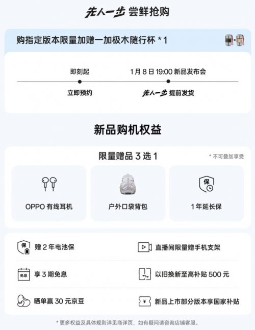1月8日,一加 Turbo 6系列将正式发布。为带给消费者更多权益,京东携手一加打造先人一步加速换新计划,发布会后购机可享先人一步提前发货,部分机型最快半小时送达,购一加Turbo 6限量加赠一加极木随行杯。此外,新品上市即享部分地区国家补贴至高优惠15%。来京东下单一加 Turbo 6系列还可享限量权益随心选,包括户外口袋背包、1年延长保、OPPO有线耳机(限一加 Turbo 6),多项权益可任选一项。即日起,消费者可到京东APP预约新机,方便发布会后第一时间下单。