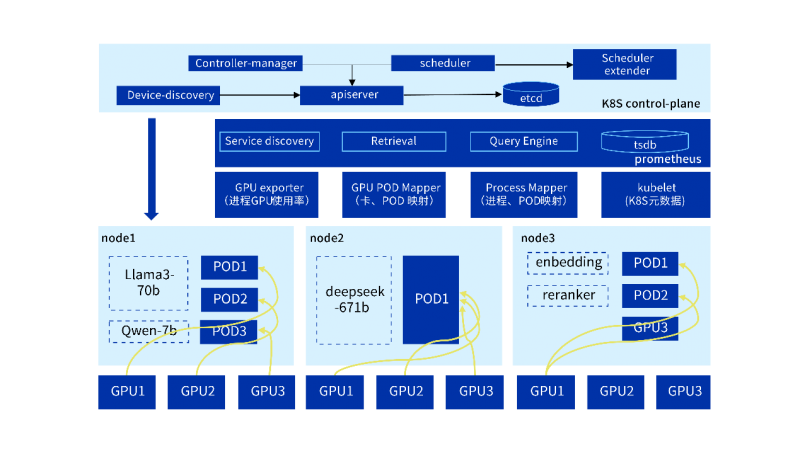 例如,在多GPU节点集群中,系统可能同时运行Llama3-70b、Qwen-7b、DeepSeek-671b 等不同规模大模型,以及embedding、reranker等辅助模型,通过精细调度将Pod与指定 GPU绑定——这种复杂部署下,传统工具无法定位单个Pod的资源占用情况,给多租户计费、故障排查、性能优化带来巨大挑战。