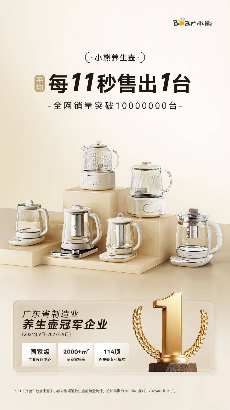 可以这么说,养生壶成为了年轻人践行轻养生生活的“中坚力量”。而这股热潮中,小熊电器养生壶的表现尤为亮眼:2022年1月1日至2025年6月15日期间,小熊电器养生壶全网销量突破1000万台,相当于每11秒就有1台售出,连续7年稳居养生壶市场占有率第一。销量之外还有权威认证:2024年斩获广东省制造业单项冠军企业称号,2025年全玻璃养生壶再获“好产品”奖项。