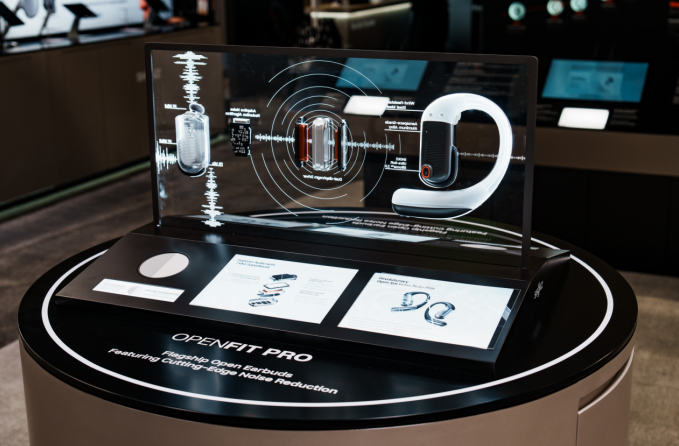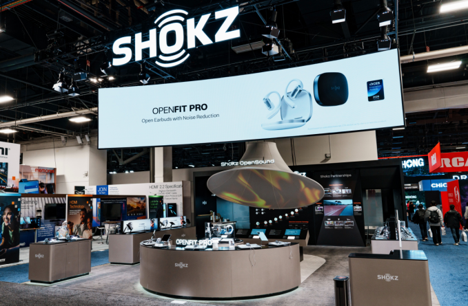 在CES展台,韶音特别围绕OpenFit Pro打造了沉浸式视听互动体验区,通过环幕投影,模拟办公、健身、咖啡厅、城市街头等多场景。参观者可亲身佩戴OpenFit Pro,直观感受其在各场景下的滤噪效果与音质表现,沉浸式理解“开放式滤噪”带来的体验革新。