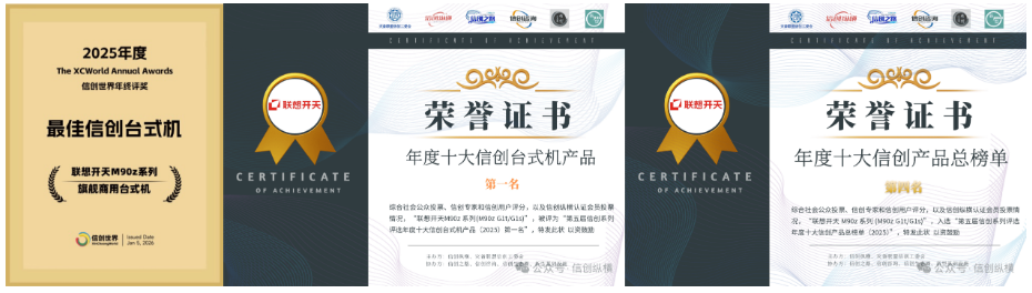 在应用最广泛的桌面办公领域,联想开天M90z系列台式机凭借均衡强悍的综合素质,成为年度市场赢家,一举拿下信创世界“年度最佳信创台式机”及信创纵横“年度十大信创台式机”榜首。