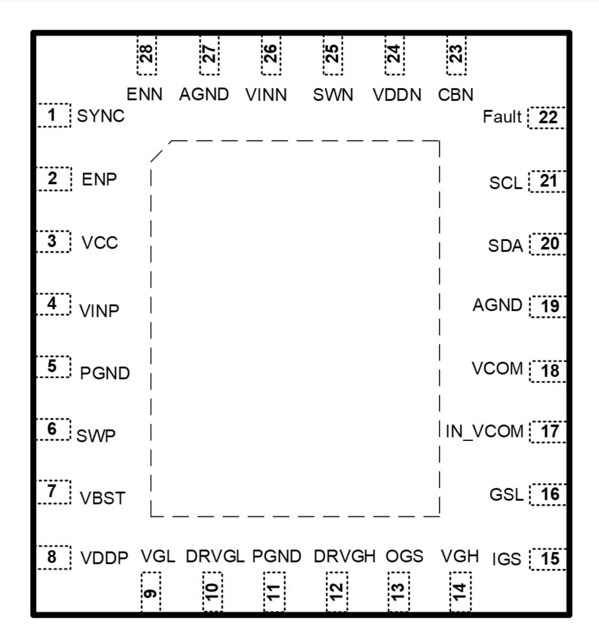 MPQ5613D-AEC1强大的保护功能可保证设备的安全运行,具体功能包括输入欠压锁定 (UVLO) 保护、SWP/SWN 逐周期限流保护、过温保护 (OTP)、VDDP/VDDN/VGH/VGL 欠压保护 (UVP)、VCOM 输出过流保护 (OCP) 以及VDDP输出限流保护。