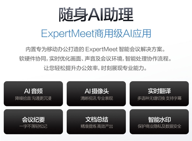 华硕破晓Ultra深度整合AI能力于商务场景,内置ExpertMeet AI会议助手,提供AI降噪拾音、清晰视讯、实时字幕翻译、会议纪要自动生成及智能文档摘要等强大功能。
