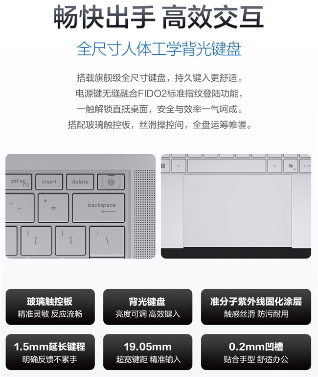 全尺寸人体工学背光键盘手感出色,长时间录入依然舒适。特别配备的玻璃触控板,丝滑操控间,全盘运筹帷幄,实现效率倍增。电源键无缝融合FIDO2标准指纹登录功能