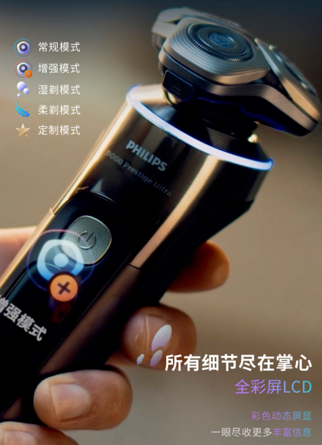 (2)智能系统:配备SkinIQ Pro五重智能剃须模式,柔剃模式适配敏感肌+细软胡须,增强模式专攻粗硬/浓密胡须,泡沫、常规、定制模式覆盖多元场景。PowerAdapt动力自适应技术每秒感应胡须密度500次,实时调节功率,避免粗硬胡须导致的卡顿拉扯;双重引导光环每秒3000次监测剃须压力,三色反馈力度、二色引导路径,提升全胡型剃净精准度,杜绝暴力剃须。