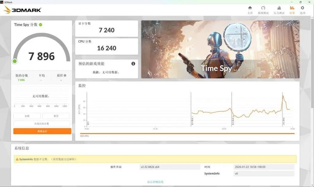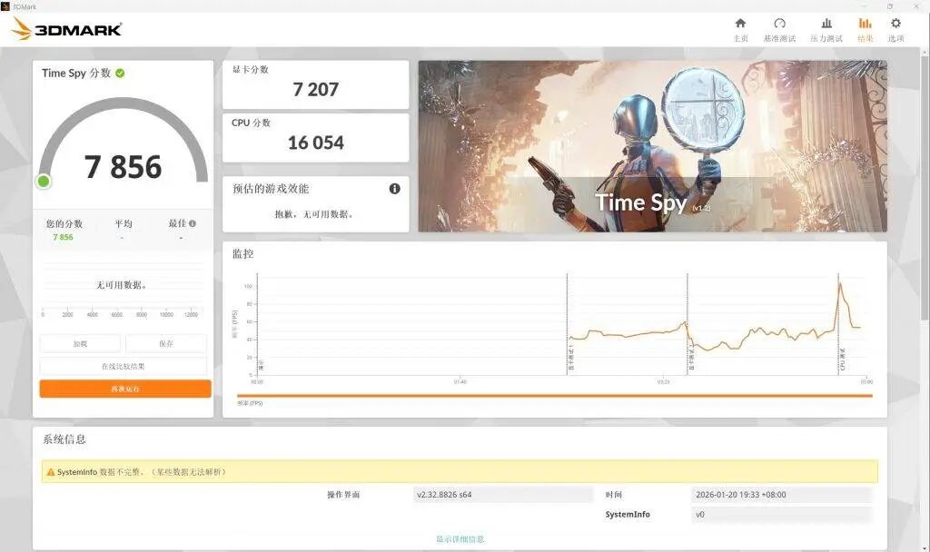 测试图形性能的 3D Mark Time Spy 环节,388H 的离电得分为 7856 分(GPU 分 7207分,CPU 分 16054),连电得分为 7896 分(GPU 分 7240分,CPU 分 16240),确实与 3060 入门级游戏本水平相当。