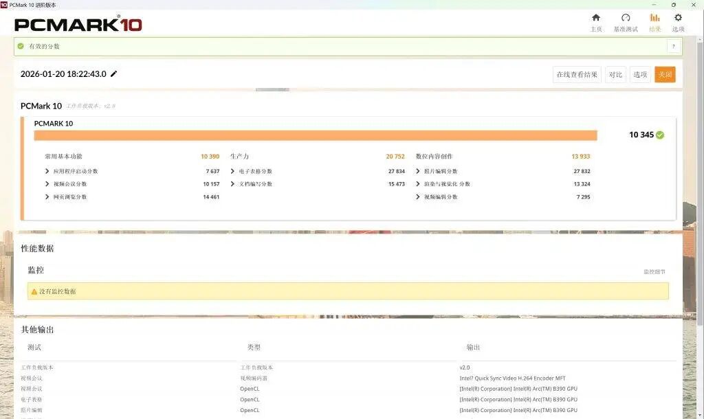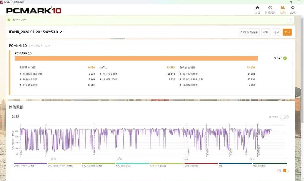 不过,连电和离电的差距在更综合的 PC Mark 10 跑分中进一步体现:10345 比 8673。