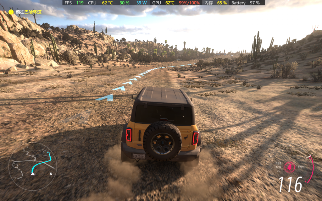 测试的几款游戏中,画面表现最好的当属《极限竞速:地平线 5》,不仅 1080P 高画质下能跑 120fps,还能开中等光追效果,跑车开起来心旷神怡。