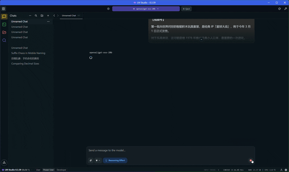 通过 LM Studio,我本地部署了一个 20B 的 GPT-OSS-GGUF 模型,这是去年 8 月 OpenAI 推出的开源模型。