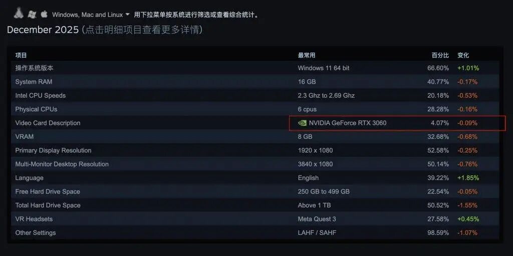 去年 12 月的 Steam 硬件调查显示,RTX 3060 依旧是这个平台上使用率最高的显卡,证明即使这已经是接近 5 岁的产品,依旧是一个足以应对大部分大型游戏的性能标杆。